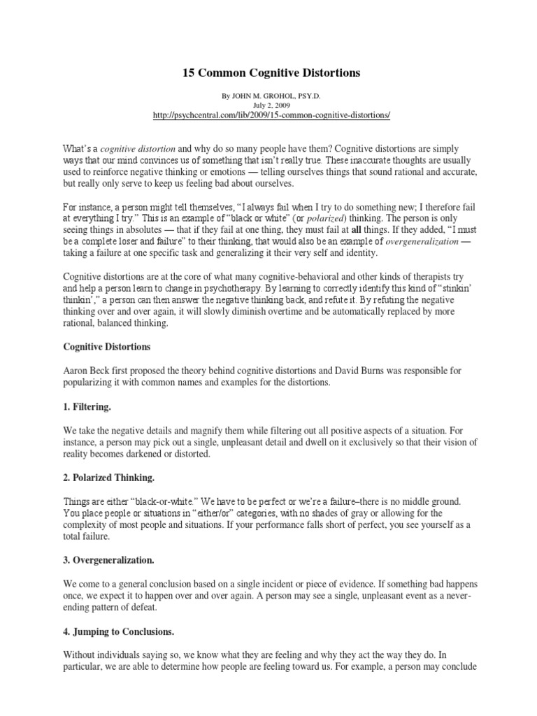 15 Common Cognitive Distortions PDF Psychotherapy