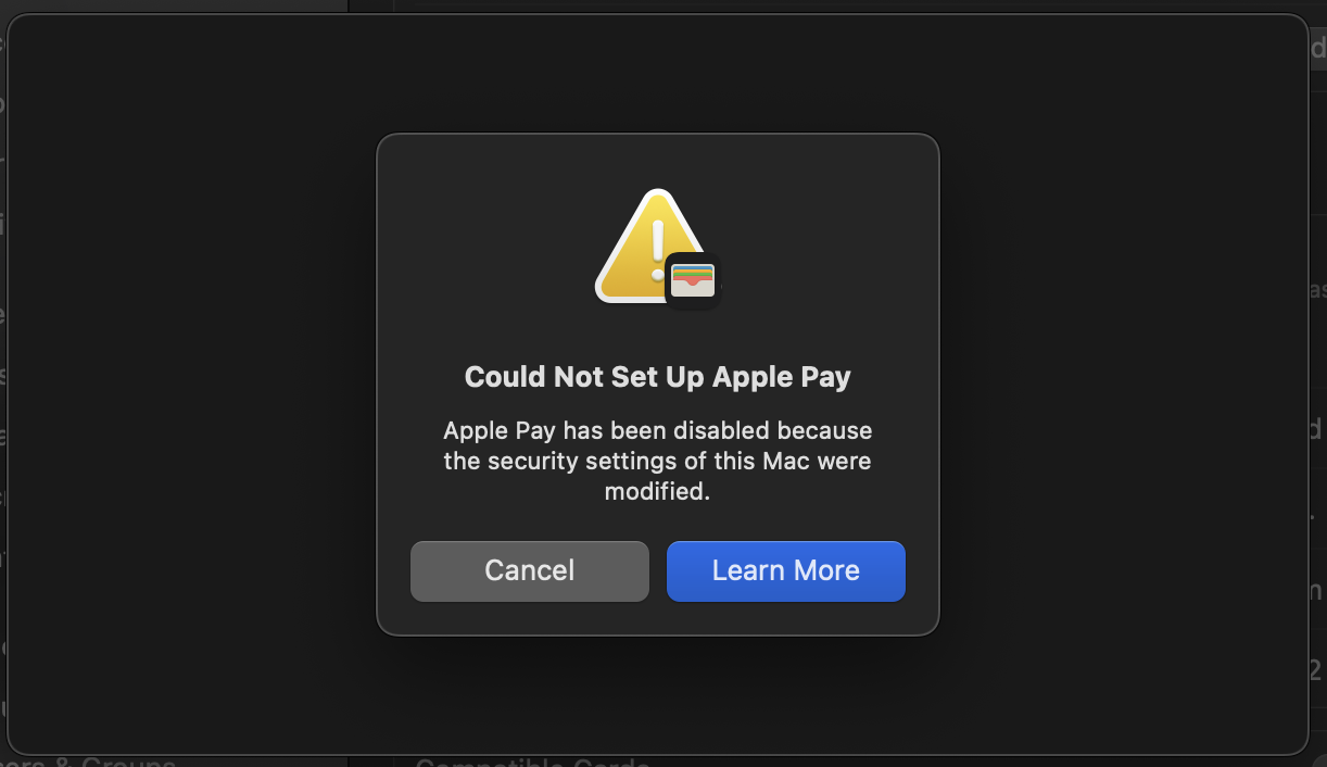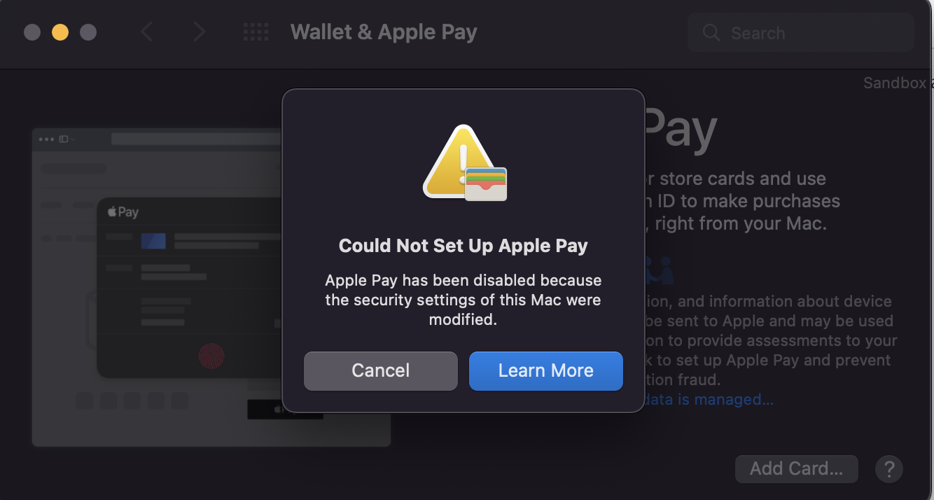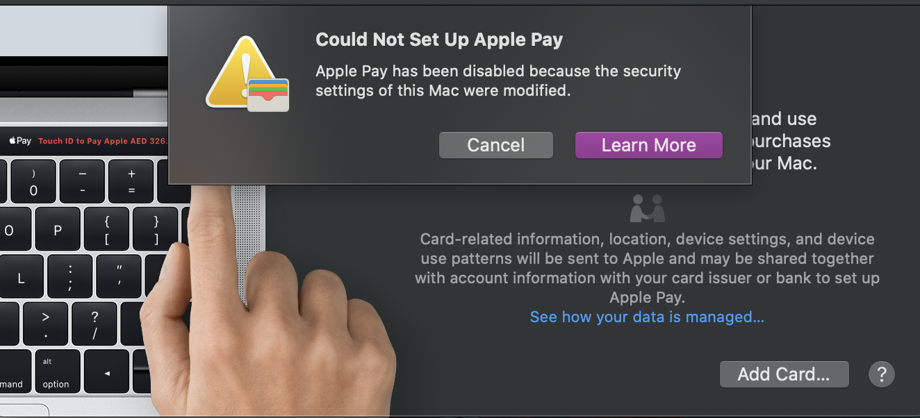 Apple Pay Has Been Disabled Because The Security Settings - I just bought my new 16 macbook pro and was having difficulty setting up apple pay on this laptop and got this message : I did try all the suggest advice and none of them helped. A reset button for apple pay would be so much easier!