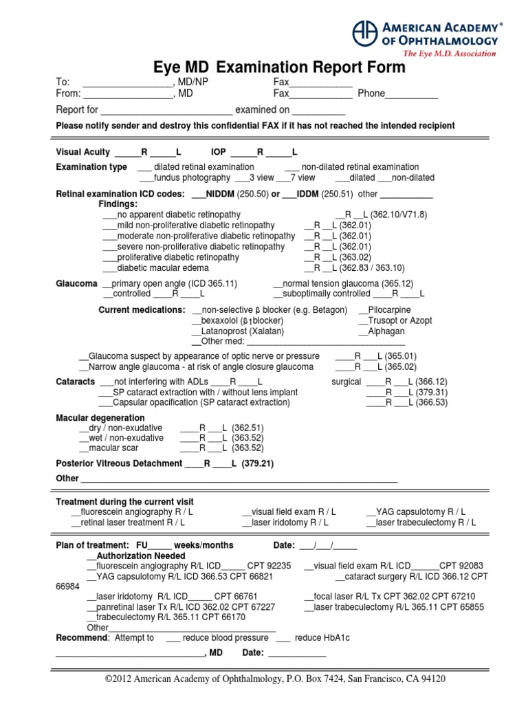 Please complete and sign the eye care physician section. Eye examination report for diabetes important health screening present this form to your eye care professional and ask them to return it to your. Fax the form to the patient’s eye care physician. The new aoa diabetes eye examination report, developed by the aoa diabetes eye care project team and the.