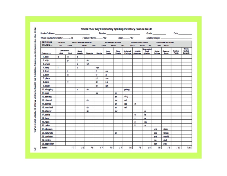 Float t fl oa 6. Words their way elementary spelling inventory feature guide student’s name _____ teacher _____ grade _____ date _____ words spelled. Ship p i sh 3. Words spelled correctly initial final 1. This guide explains how to assess students for placement in words their way™: